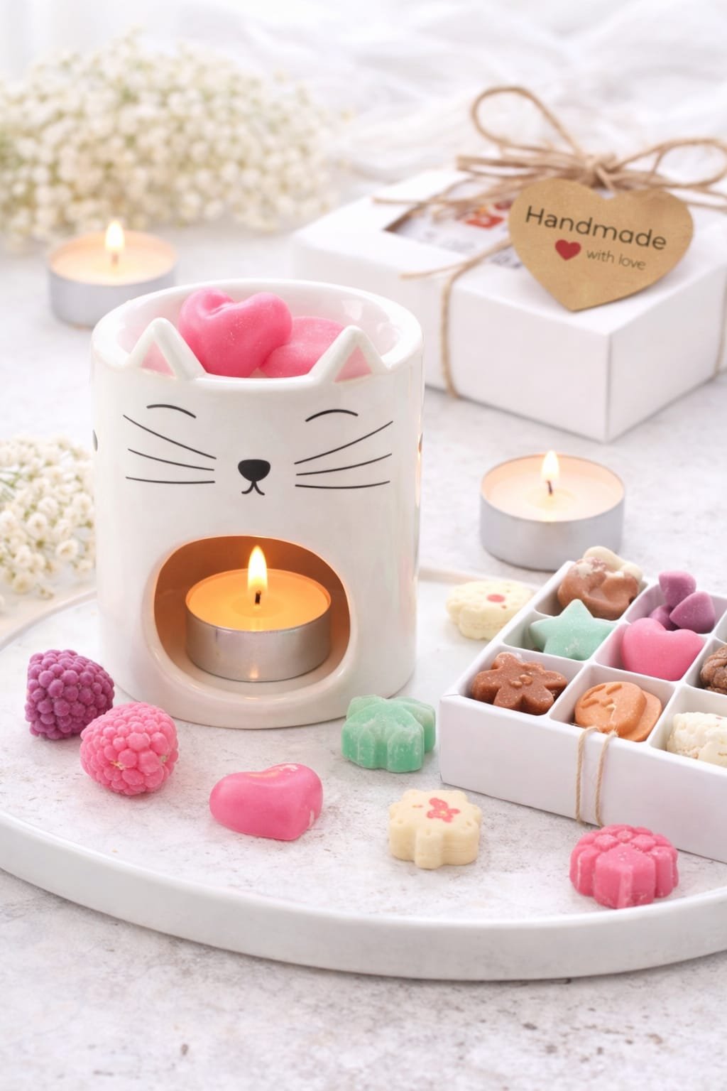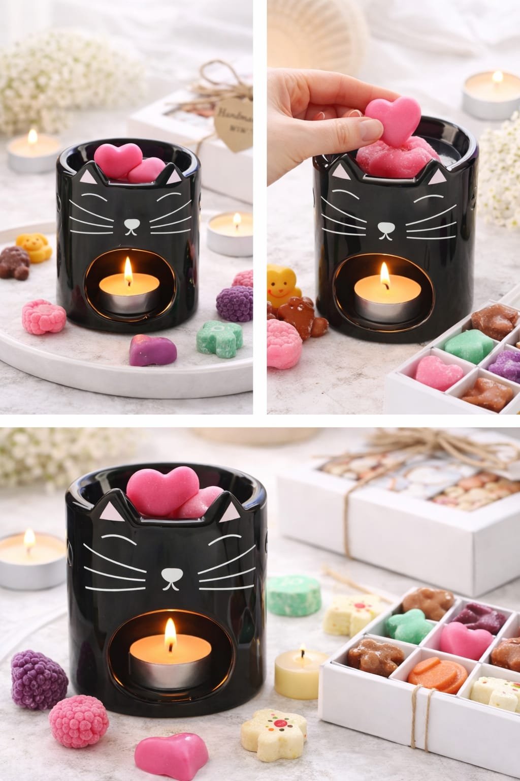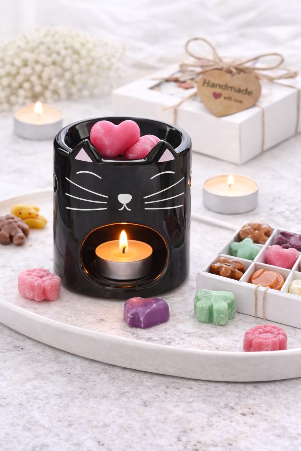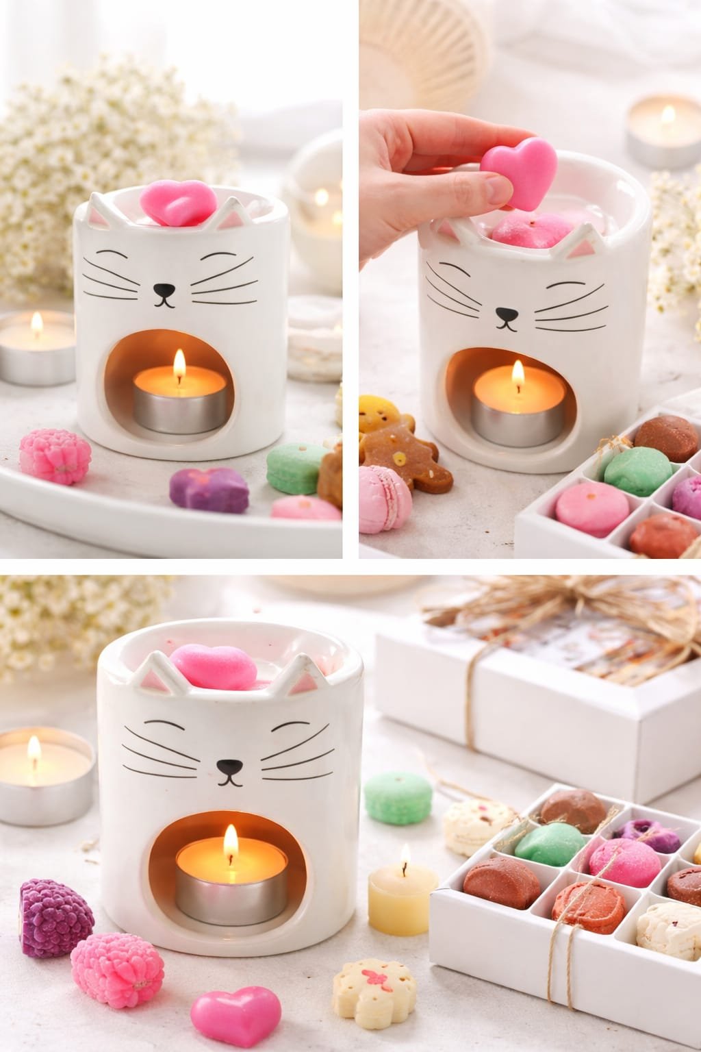 Dale un toque dulce y acogedor a tu hogar con este encantador quemador de cerámica con diseño de gatito, perfecto para los amantes de los aromas y la decoración. Su acabado en color blanco y sus delicados detalles hacen que encaje fácilmente en cualquier espacio, aportando calidez y estilo.